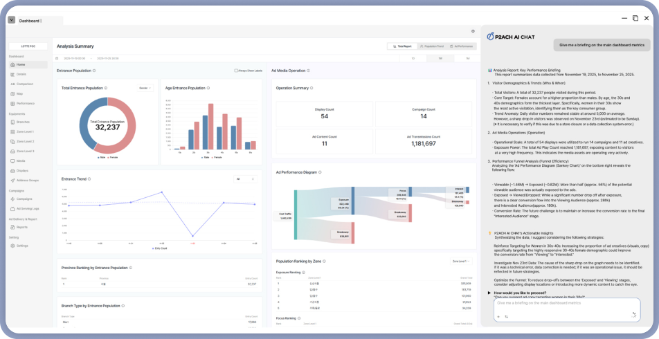 Solutions AI活用のデータインサイトでリテールメディア価値を最大化P2ACH AIソリューションは、人口統計と動線データを活用して精度の高いインサイトを提供します。滞在時間、動線分析、ヒートマップなどリテール特化機能で、よりスマートな意思決定を支援します。 下のアイコンをクリックして各ソリューションをご覧ください!